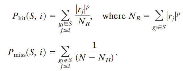 where S is a gene set, i is the index in the ordered list, |rj|p is a weighted p-value (p is an arbitrary exponent selected to scale this value), NR is the sum of the weighted p-values for all genes in S, and NH is the number of genes in S. After the program has iterated through the entire ordered list, it conducts a pairwise comparison of the Phit and Pmiss values at each index to determine the maximum absolute difference between the two values. This difference is returned as the enrichment score.