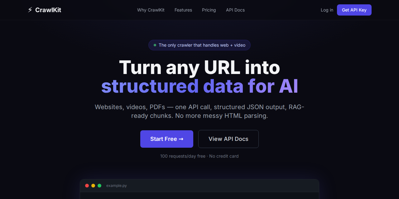 # API available at http://localhost:8000No setup needed. Get a free API key at crawlkit.org