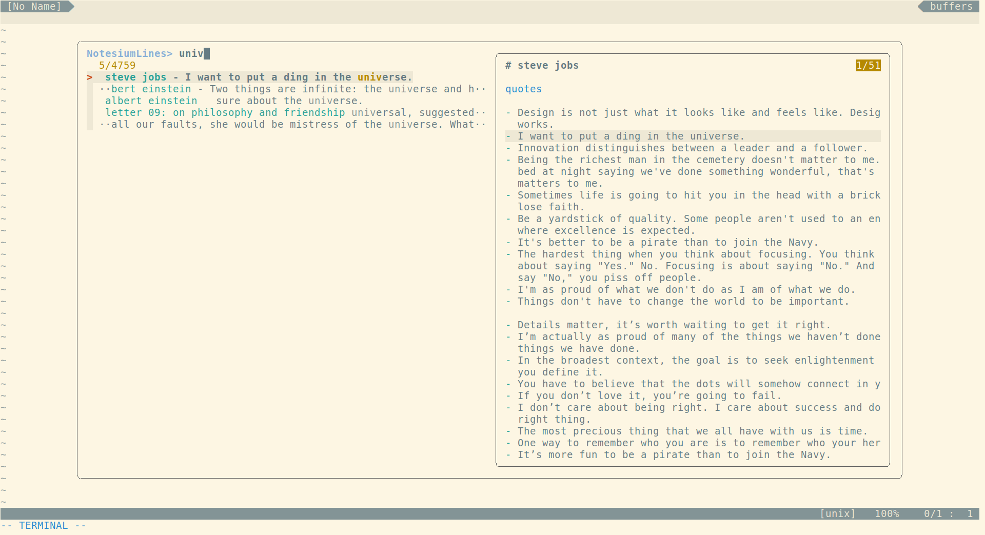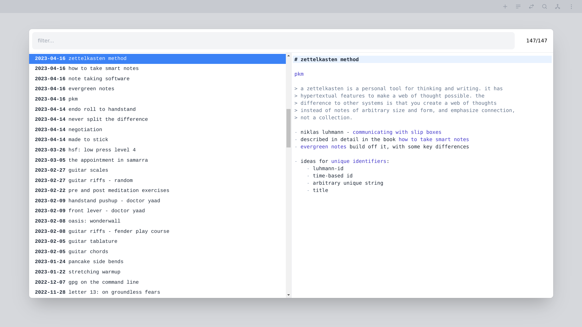 xdg-open notesium:///home/user/notes/625d563f.mdFor Vim users, opening the listing is useful when integrated with a