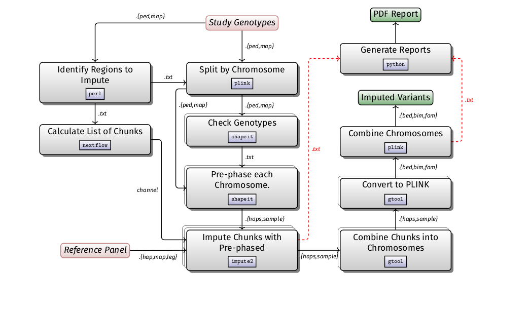 Imputation is likely to be run in the context of a GWAS, studying population structure, and admixture studies. It is computationally expensive in comparison to other GWAS steps. The basic steps of the pipeline is described in the diagram below: