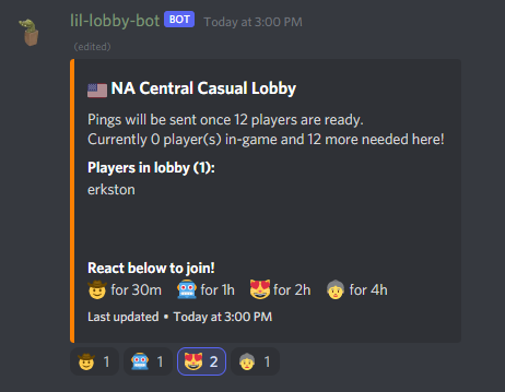 This is a discord bot designed to place users into a "lobby" that directs players to a server once a set amount have joined. Users join the lobby by clicking a reaction in discord, different reactions have different lengths of time for the bot to wait before they remove the user (or until the lobby is full and "launches").