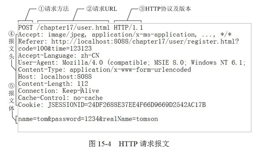 ⑤ 是报文体,它将一个页面表单中的组件值通过param1=value1¶m2=value2的键值对形式编码成一个格式化串,它承载多个请求参数的数据。不但报文体可以传递请求参数,请求URL也可以通过类似于“/chapter15/user.html? param1=value1¶m2=value2”的方式传递请求参数。