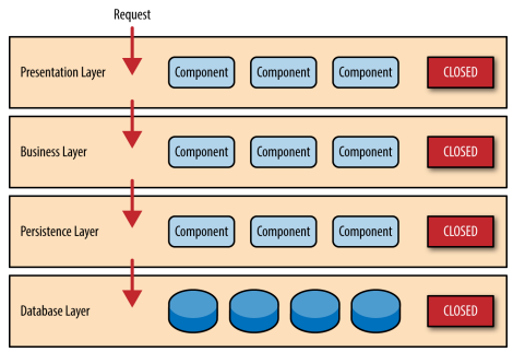 注意表1-2中每一层都是封闭的。这是分层架构中非常重要的特点。这意味request必须一层一层的传递。举 个例子,从展示层传递来的请求⾸首先会传递到业务层,然后传递到持久层,最后才传递到数据层。