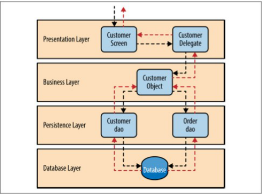为了演示分层架构是如何工作的,想象一个场景,如表1-4,用户发出了个请求要获得客户的信息。黑色的箭头是从数据库中获得用户数据的请求流,红色箭头显示用户数据的返回流的方向。在这个例子中,用户信 息由客户数据和订单数组组成(客户下的订单)。