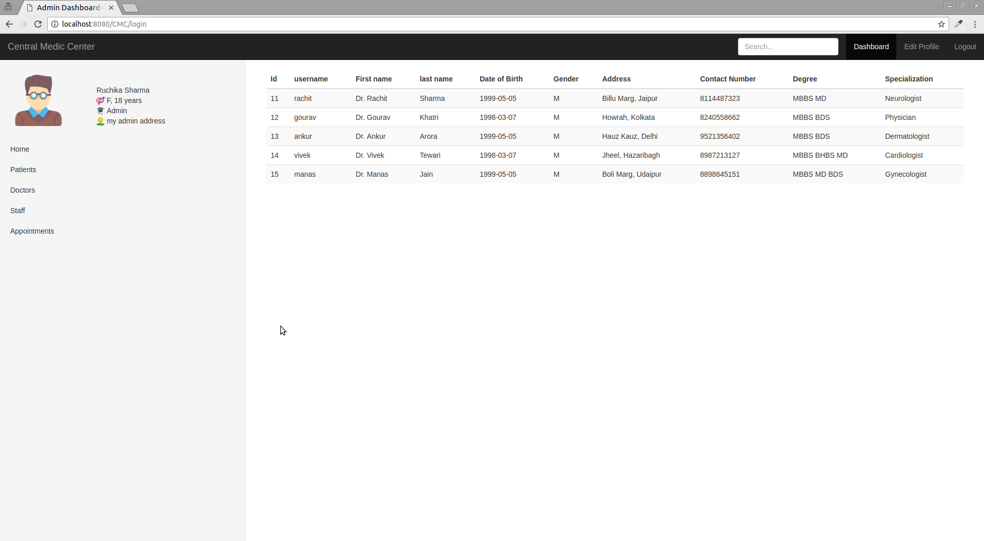 central-medic-center Centeral Medic Center is a Hospital Management System made for our 'OOP with JAVA'course project. Dashboards Patient Doctor Receptionist Lab Person Admin Technologies Used Java, Eclipse J2EE IDE, JSP, MySQL, Apache Tomcat 8.5. Our Project Proposal SRS of CMC. Screenshots Patient Dashboard Doctor Dashboard Admin Dashboard Lab Person Dashboard Receptionist Dashboard