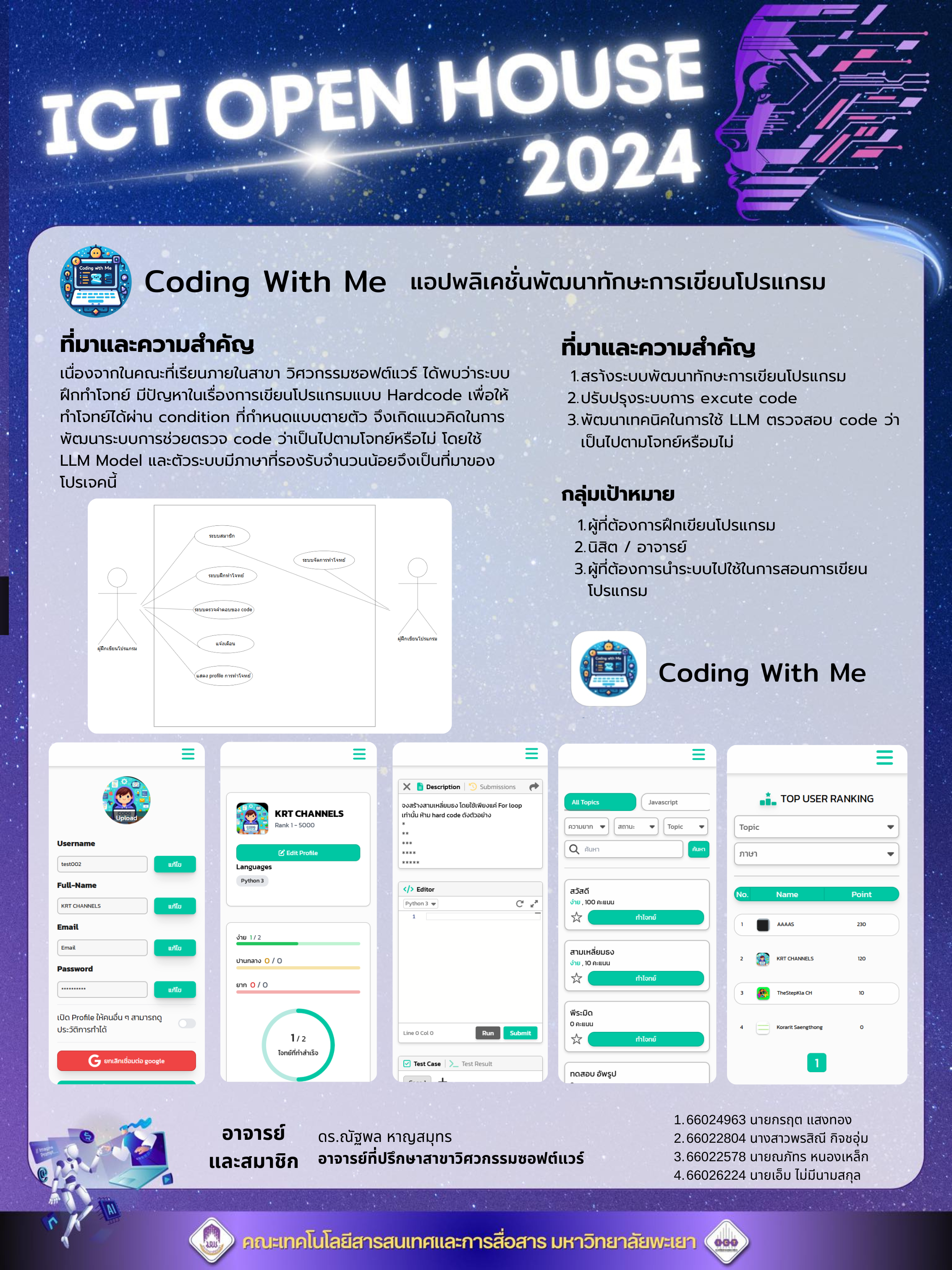 เป็นการแข่งขันโปรเจคด้าน Mobile application ภายในคณะเทคโลยีสารสนเทศและการสื่อสาร (ict) มหาวิทยาลัยพะเยา โดยได้รางวัล อันดับ 2 จากทีมกว่า 10 ทีมจากทั้งคณะ โดยเป็นการพัฒนา cross-platform (Android , PWA . Web) สำหรับการฝึกการเขียนโปรแกรมผ่านการทำโจทย์คล้าย ๆ อย่าง leetcode โดยมีการนำ LLM มาช่วยตรวจคำตอบ