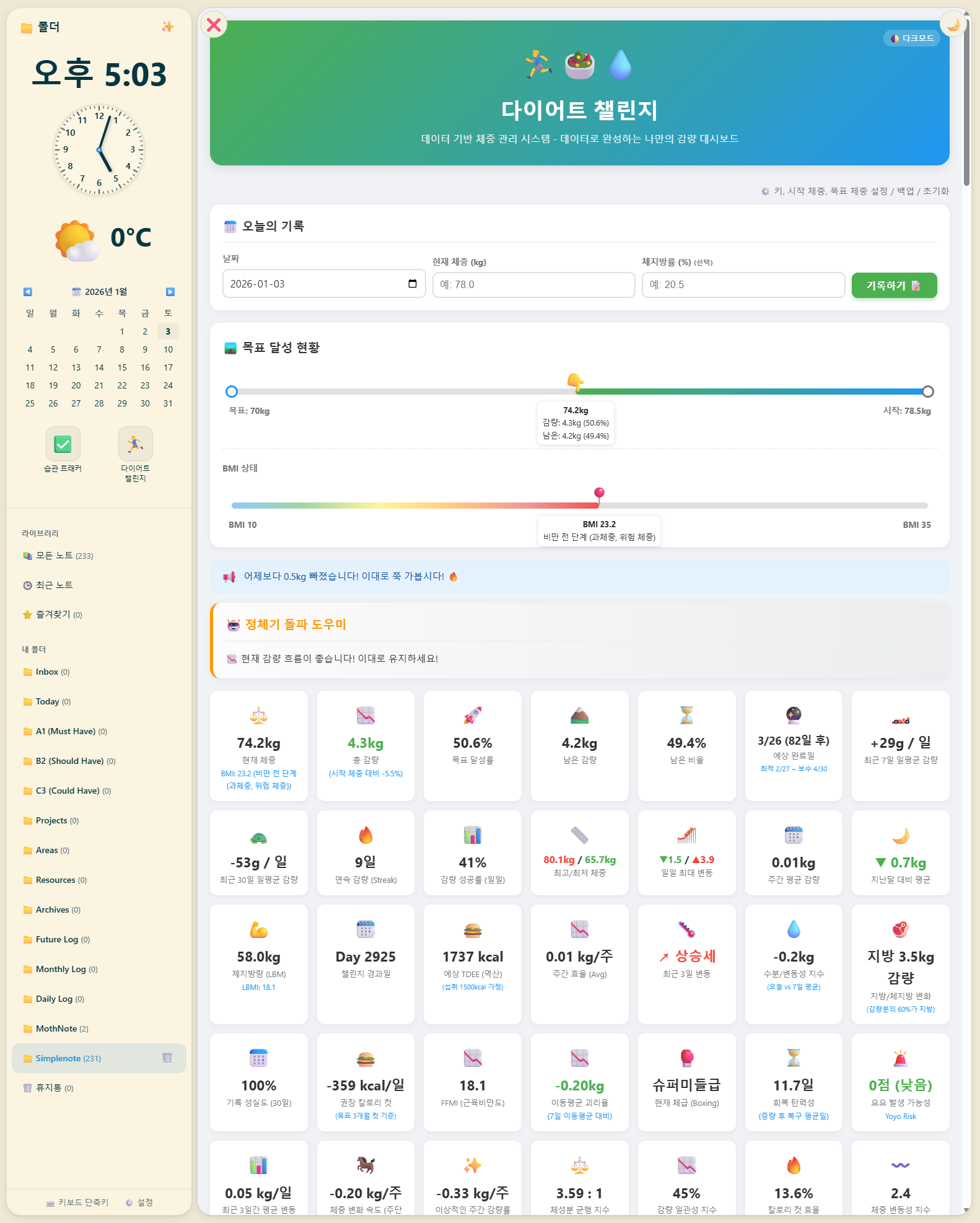 20.0 버전에서 다이어트 챌린지 기능을 추가했습니다. (체중과 체지방을 기록하면 BMI와 대사량 등 핵심 정보를 자동 계산하고, 이동평균선과 히트맵 등 다양한 차트로 변화 흐름을 직관적으로 보여줍니다. 정체기 돌파 솔루션과 요요 위험 경고 같은 데이터 기반의 심층 분석을 제공하며, 다양한 업적 뱃지 시스템으로 감량 의지를 북돋아 줍니다.)