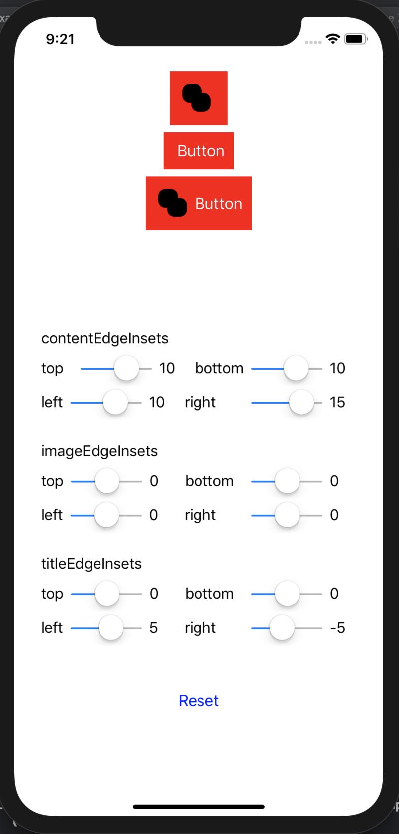 Run the app and use the sliders to edit the button insets. Double tap a label ("top", "left", etc) to start animating the inset. Use the reset button to cancel all animations and reset everything to 0.