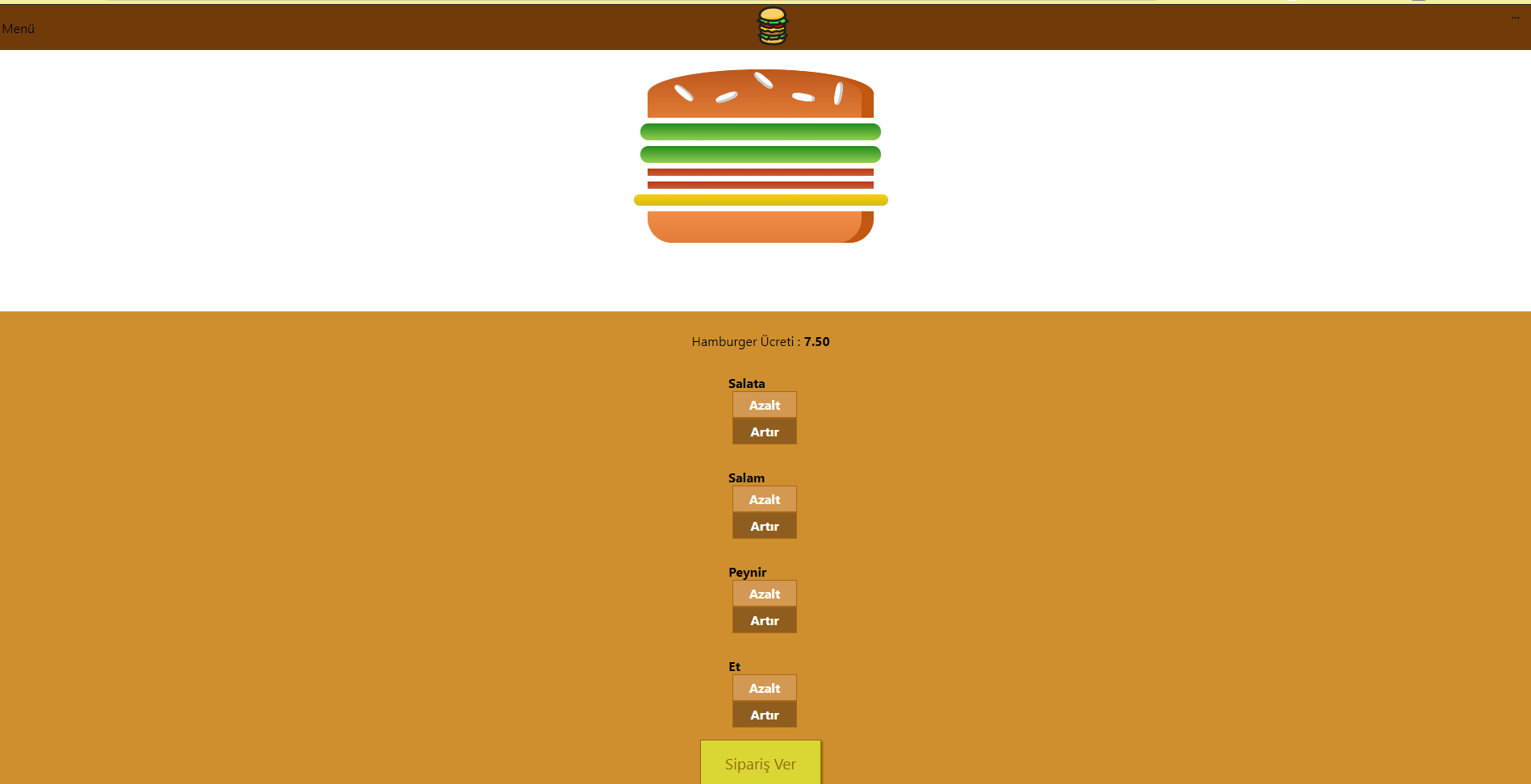 React Hamburger Siparişi Kullanılanlar React Css Firebase PropTypes Class Base Components Axios SweetAlert npm install diyerek bağımlılıkların yüklenmesi npm start diyerek projenin ayağa kaldırılması örnek görüntü