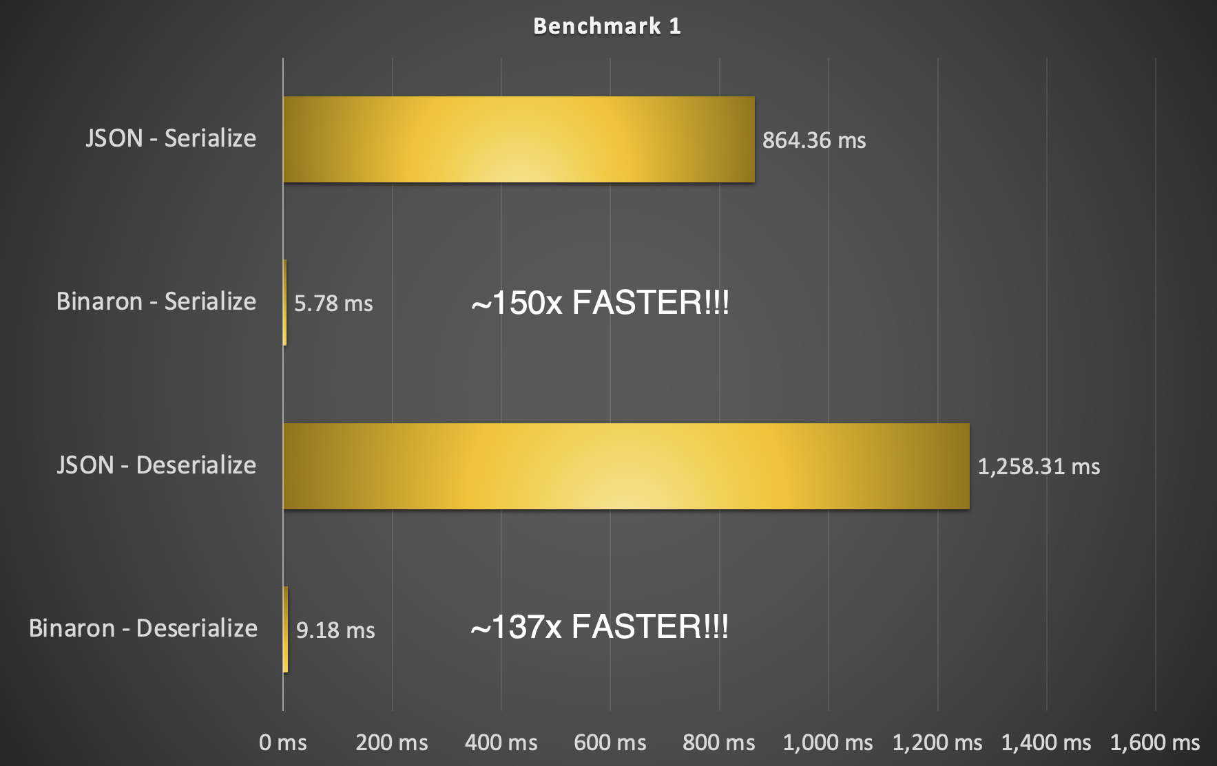 In this benchmark, Binaron.Serializer is nearly 150x faster than Newtonsoft.JSON in serialization and around 137x faster in deserialization!